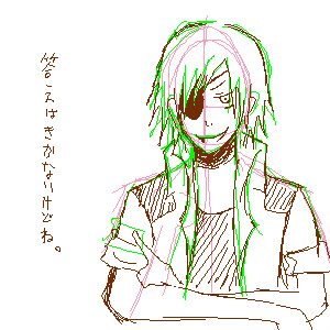 最近よくみかける、下書きの線を消さないで絵描く…っていうのがカッコいいなと思って やってみたけど。 撃沈orz なんなんだこの下書きの色のセレクト(笑 台詞も気にしないで下さい。リュウタロスがすきなんです← 少ない線で短い時間でササーっと描ける人にすっごい憧れます(´∀`*) 2007.07.23 Mon 15:47:11